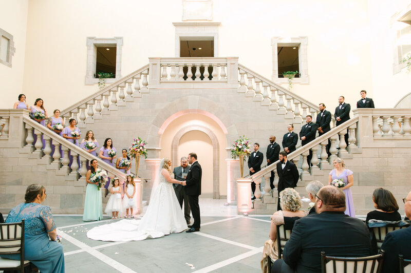 When there is no first look, the majority of your pictures have to be taken after the ceremony. Family pictures are generally done as soon as the ceremony ends because it’s the easiest time to round everyone up. Next up is full bridal party, and then bride and groom portraits. This generally runs into cocktail hour.